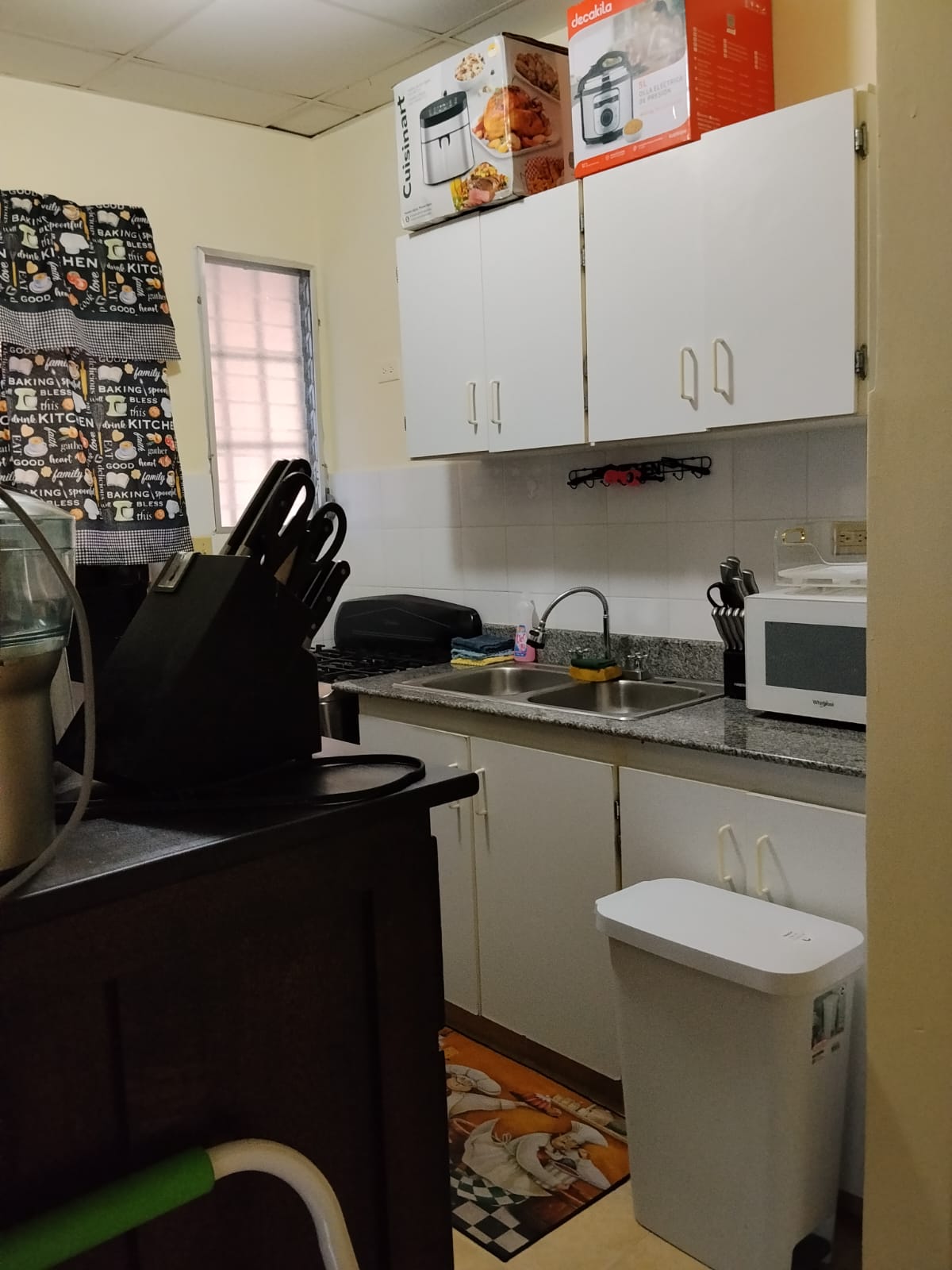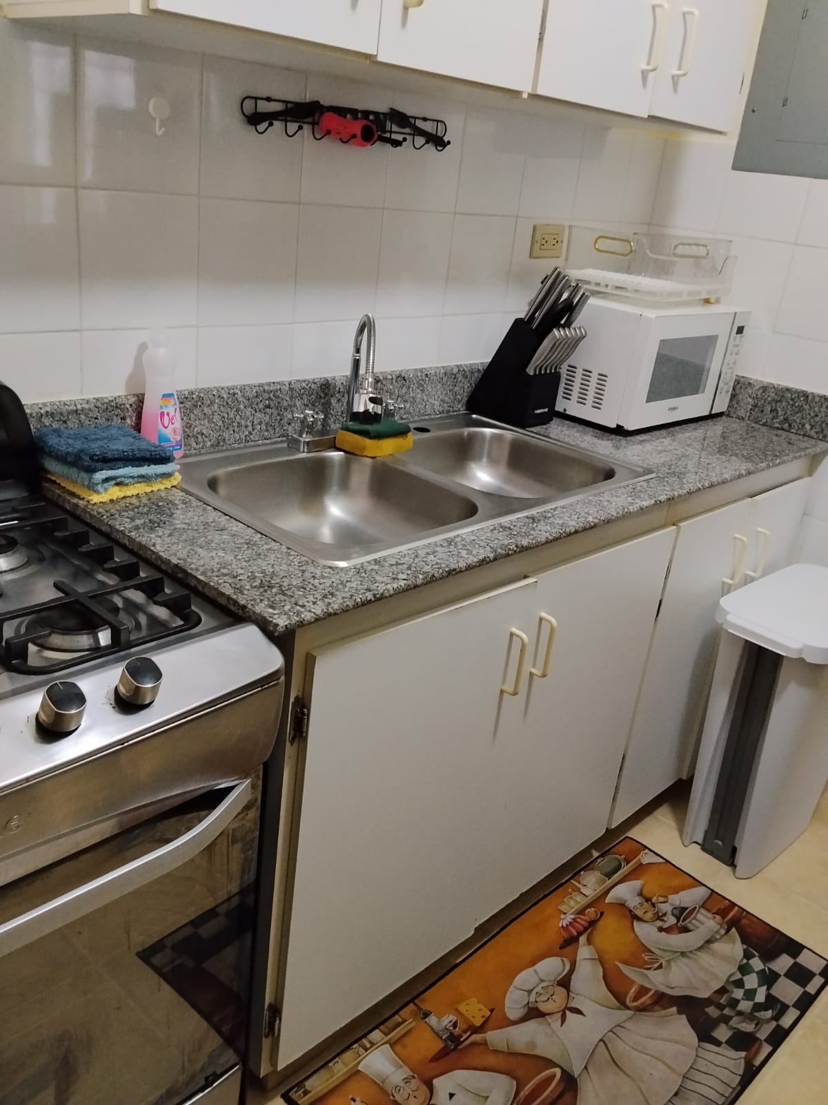 Kitchen with gas stove, fridge, microwave, washing machine and dryer